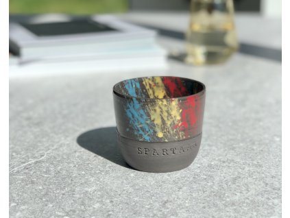 Kalíšek je ručně vyrobený ze světlé kameniny na hrnčířském kruhu s vytlačeným nápisem "Zas ráno" a růžovo černými cákanci. Má objem cca 120-140ml a rozměry přibližně 5,5 x 7cm...