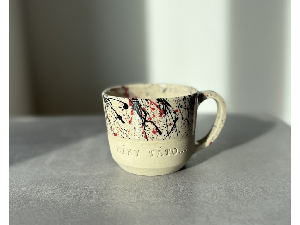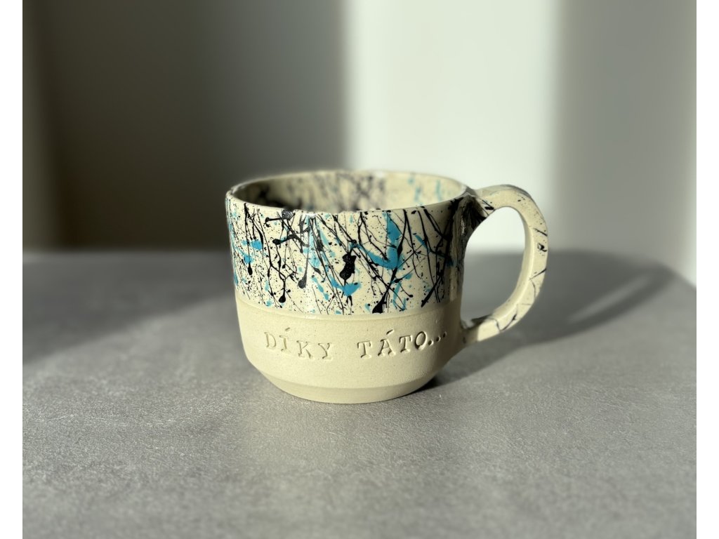 Hrnek je ručně vyrobený ze světlé kameniny na hrnčířském kruhu s vytlačeným nápisem "Díky táto..." a zdoben cákanci.