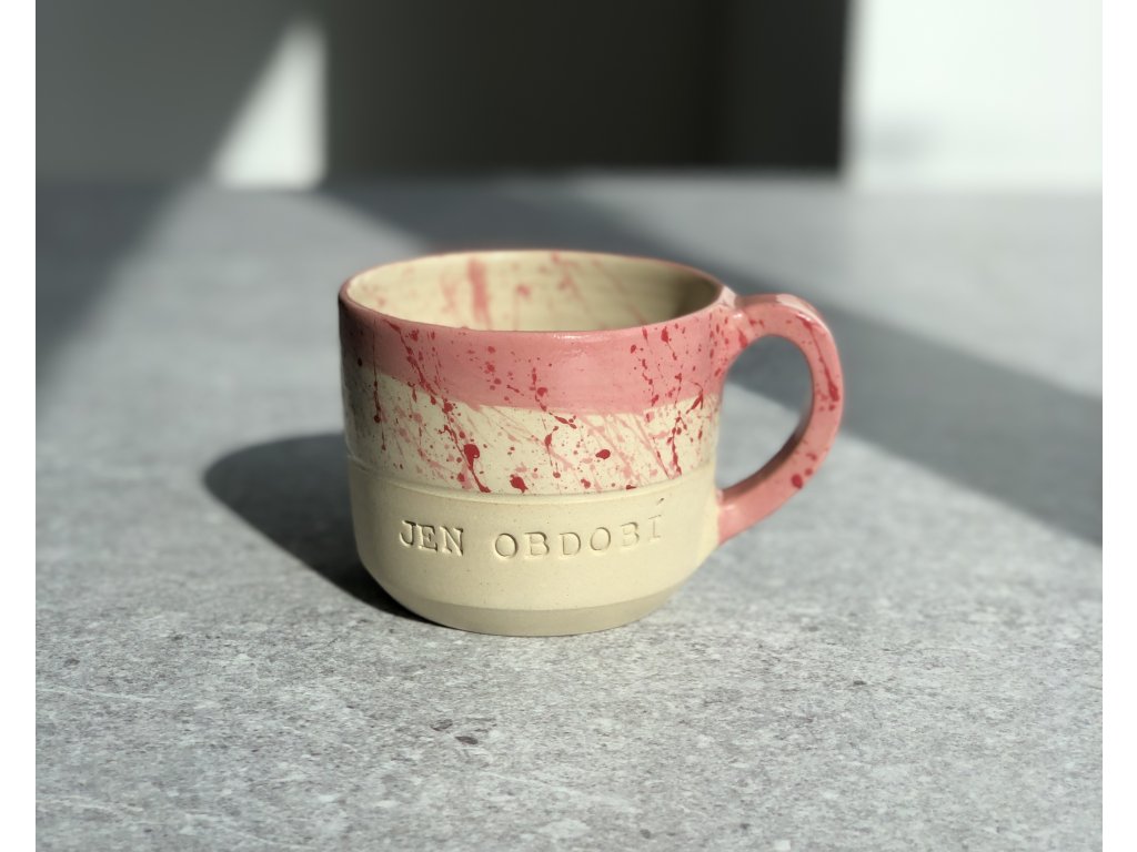Hrnek je ručně vyrobený ze světlé kameniny na hrnčířském kruhu s vytlačeným nápisem "jen období" a růžovo červenými cákanci.