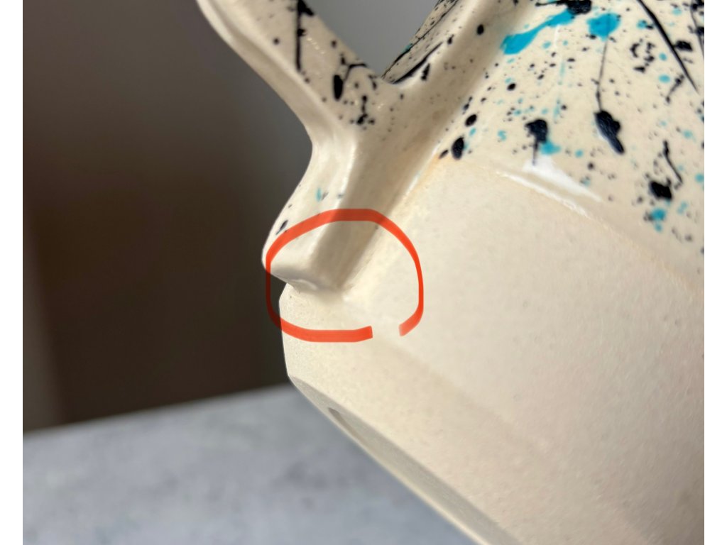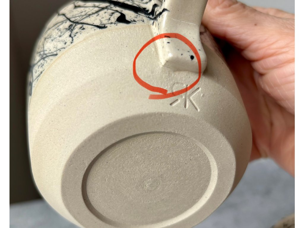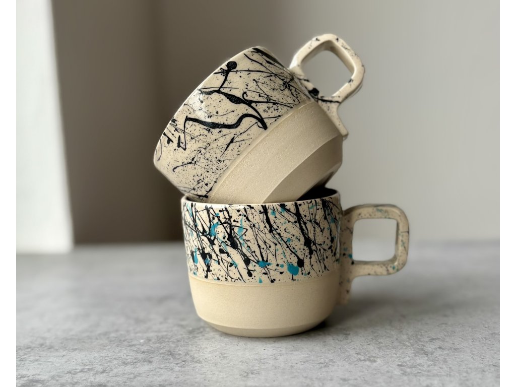 Hrnek je ručně vyrobený ze světlé kameniny na hrnčířském kruhu a zdoben cákanci.