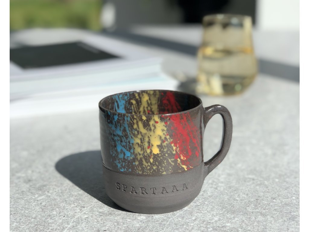 Hrnek je ručně vyrobený z tmavé kameniny na hrnčířském kruhu, s cákanci a vytlačeným nápisem "spartaaa".