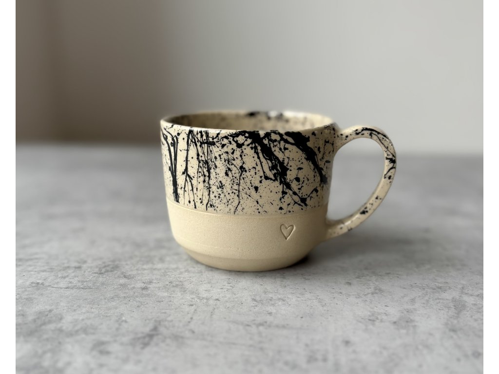 Hrnek je ručně vyrobený ze světlé kameniny na hrnčířském kruhu s vytlačeným srdíčkem a zdoben černými cákanci.