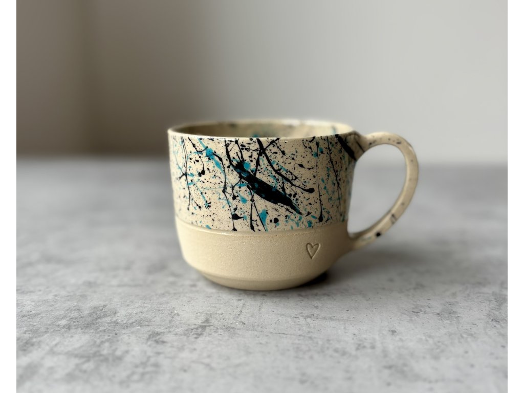 Hrnek je ručně vyrobený ze světlé kameniny na hrnčířském kruhu s vytlačeným srdíčkem a zdoben modročernými cákanci.