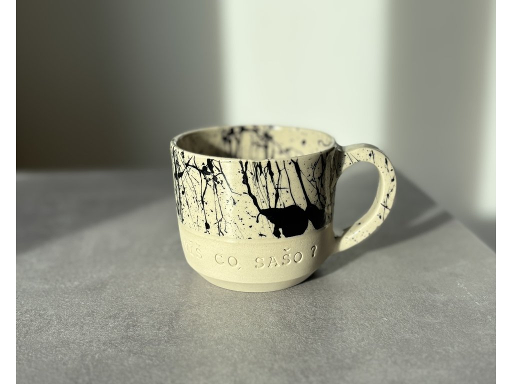 Hrnek je ručně vyrobený ze světlé kameniny na hrnčířském kruhu a zdoben černými cákanci.