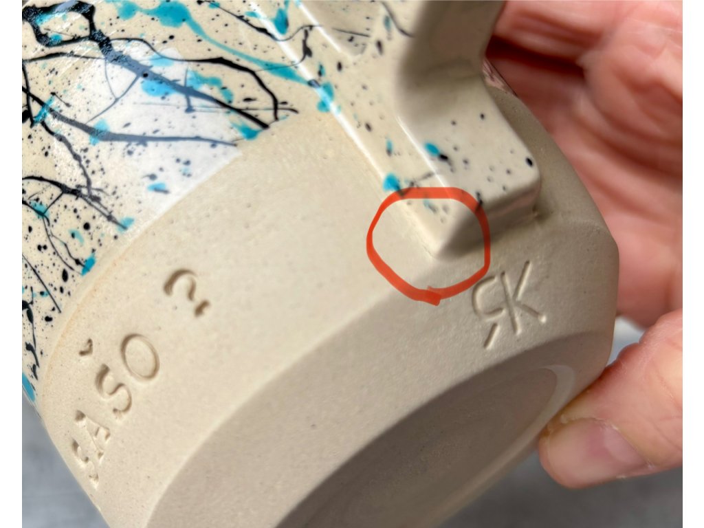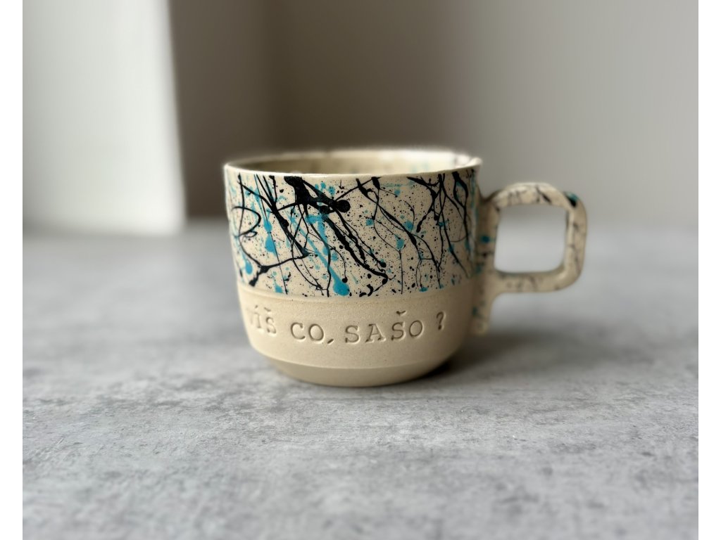 Hrnek je ručně vyrobený ze světlé kameniny na hrnčířském kruhu a zdoben modročernými cákanci.