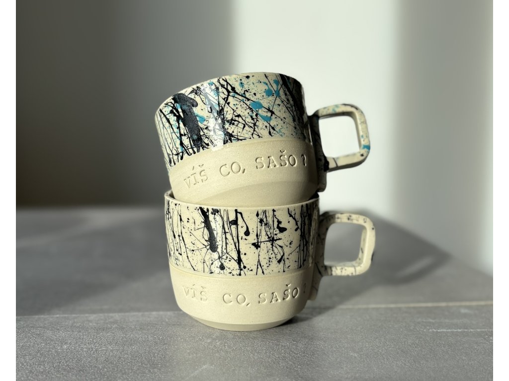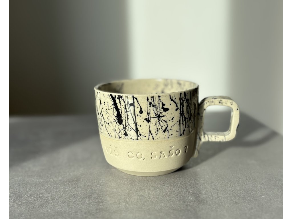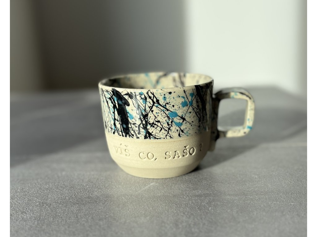 Hrnek je ručně vyrobený ze světlé kameniny na hrnčířském kruhu a zdoben cákanci.