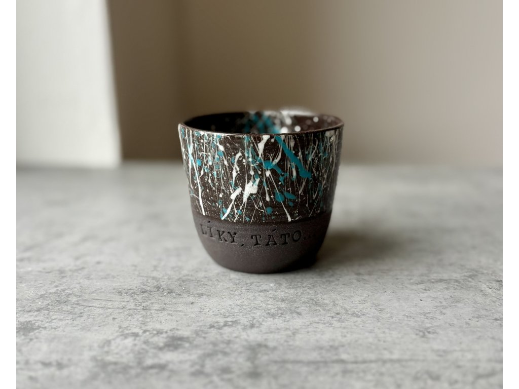 Kalíšek je ručně vyrobený z tmavé kameniny na hrnčířském kruhu s vytlačeným nápisem "Díky táto..." a zdoben bílomodrými cákanci.