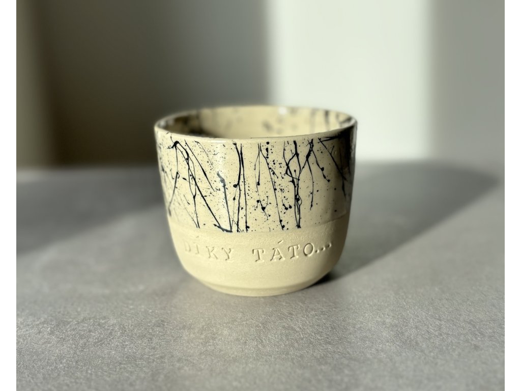 Kalíšek je ručně vyrobený ze světlé kameniny na hrnčířském kruhu s vytlačeným nápisem "Díky táto...!" a černými cákanci.
