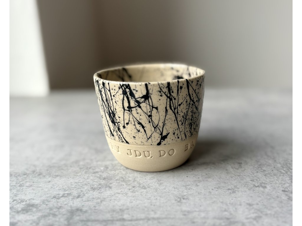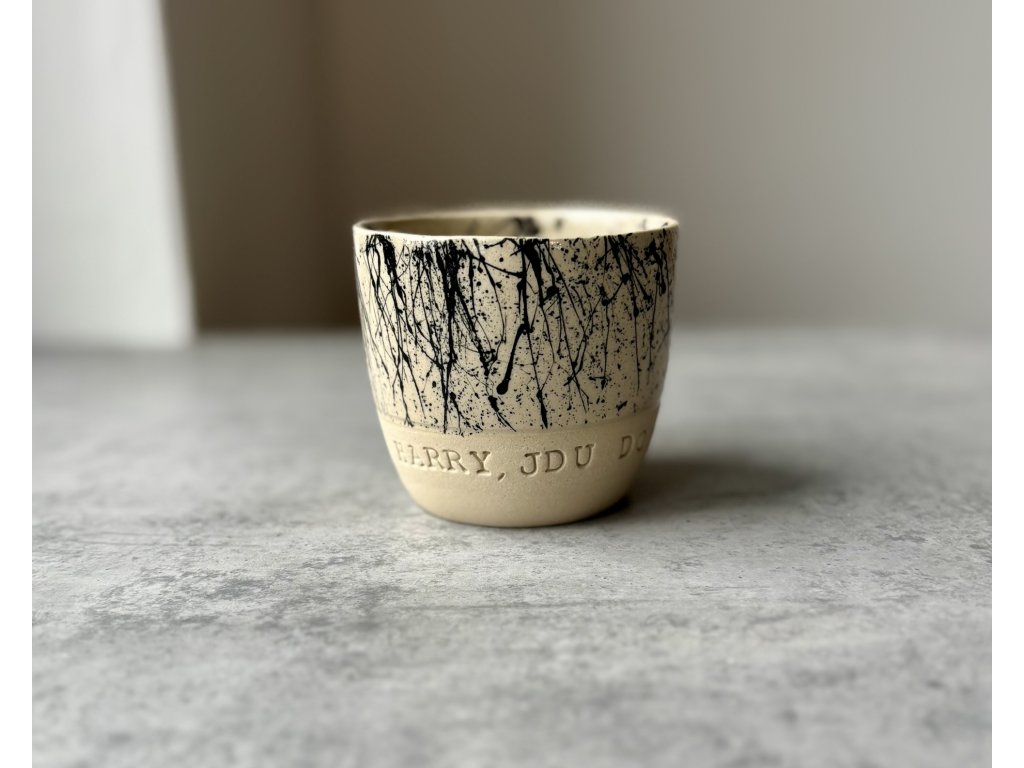 Kalíšek je ručně vyrobený ze světlé kameniny na hrnčířském kruhu s vytlačeným nápisem "Harry, jdu do baráku!" a černými cákanci.