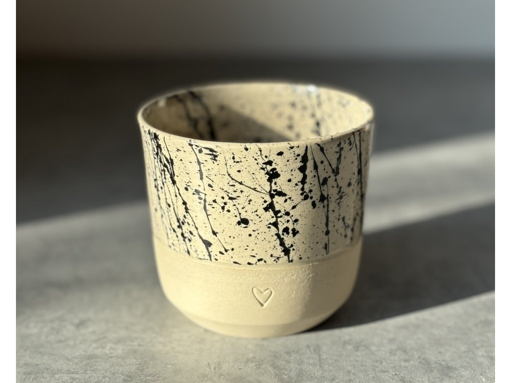 Kalíšek je ručně vyrobený ze světlé kameniny na hrnčířském kruhu s vytlačeným srdíčkem a černými cákanci.