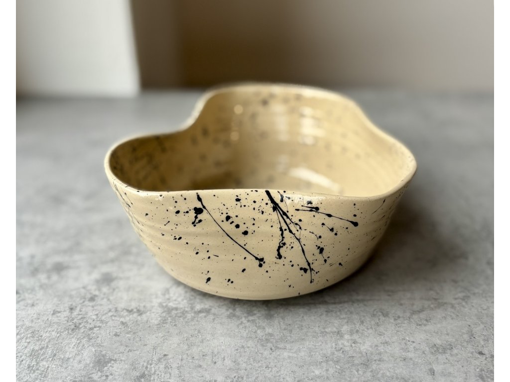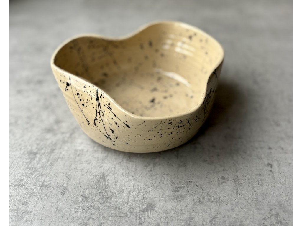Miska je ručně vyrobená ze světlé kameniny na hrnčířském kruhu. Organicky tvarovaná s černými cákanci.