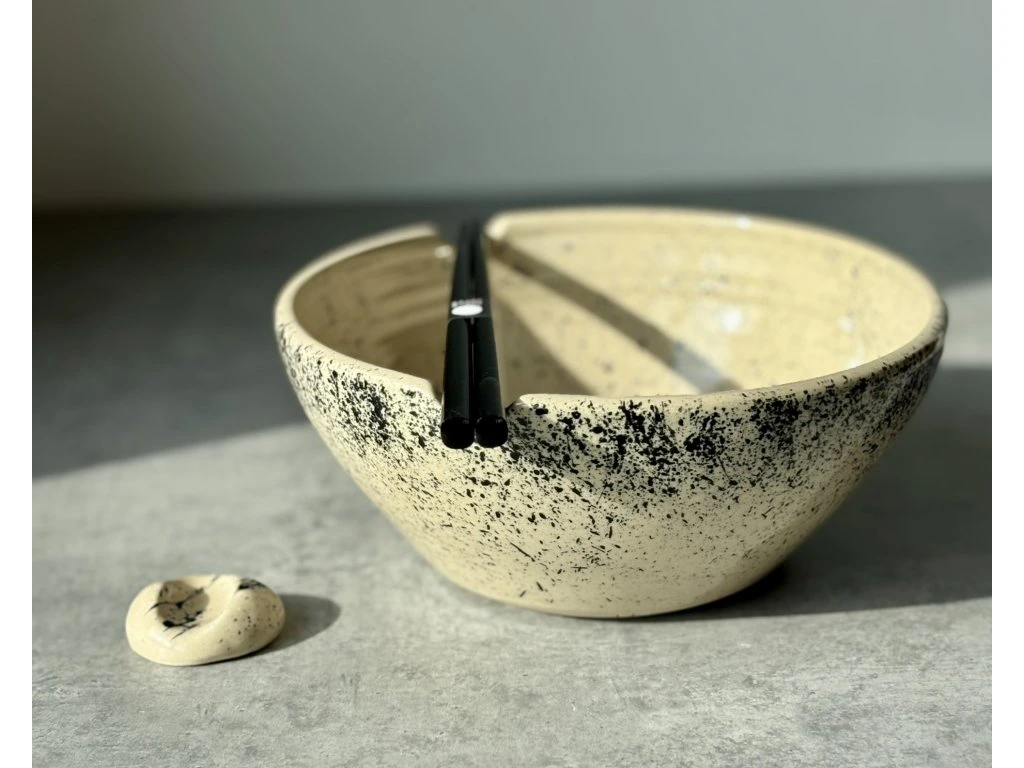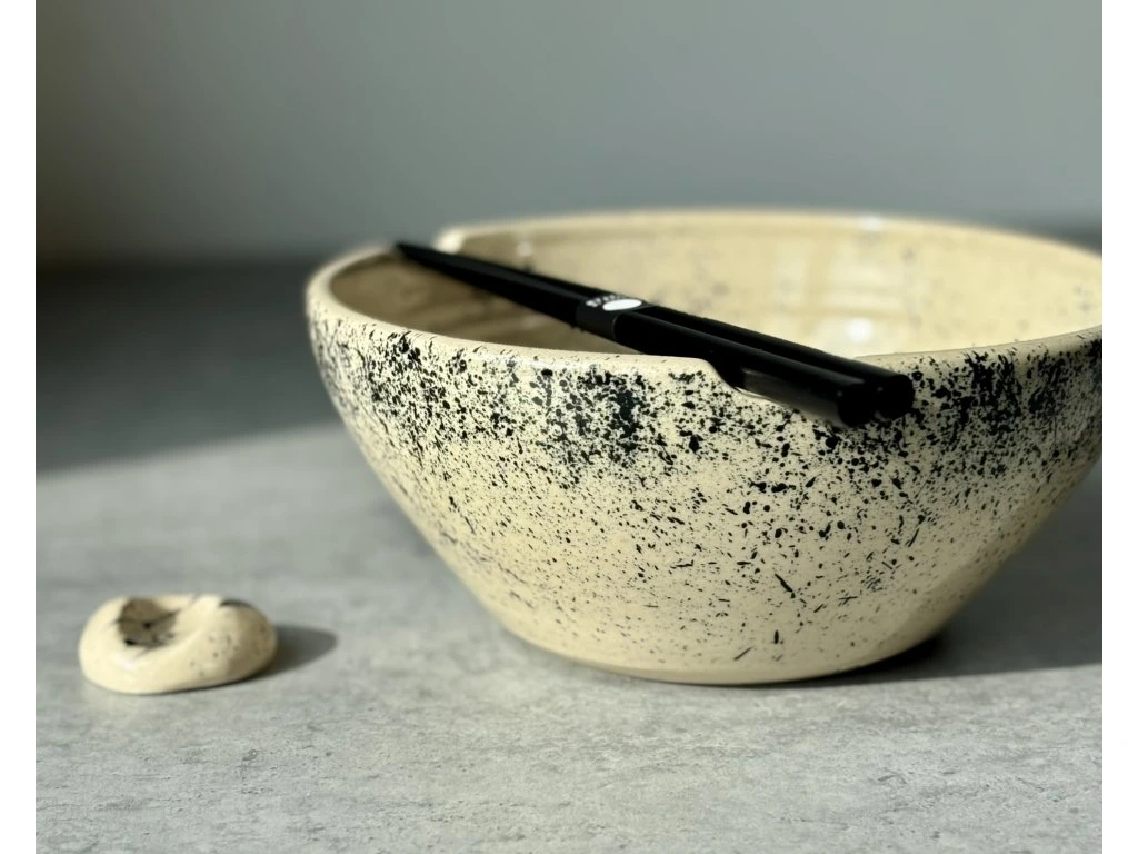 Povrch zdobí jemná, hustší struktura černých cákanců, která se soustřeďuje především v horní části misky. Dekor tak působí kompaktněji a vytváří zajímavý kontrast mezi klidným spodkem a výraznějším okrajem.