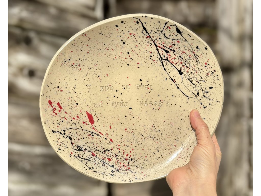 Organický talíř je ručně vymodelován ze světlé kameniny, s transparentní glazurou, černo červenými cákanci a vytlačeným nápisem "Kdo se ptal na tvůj názor?".