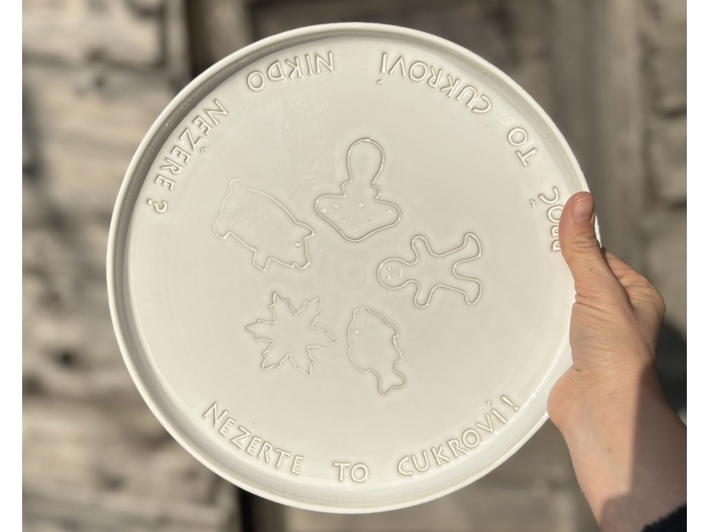 Talíř na cukroví je ručně vyroben ze světlé kameniny na hrnčířském kruhu, s bílou glazurou, vytlačeným nápisem "Nežerte to cukroví! Proč to cukroví nikdo nežere?" a vytlačeným cukrovím.