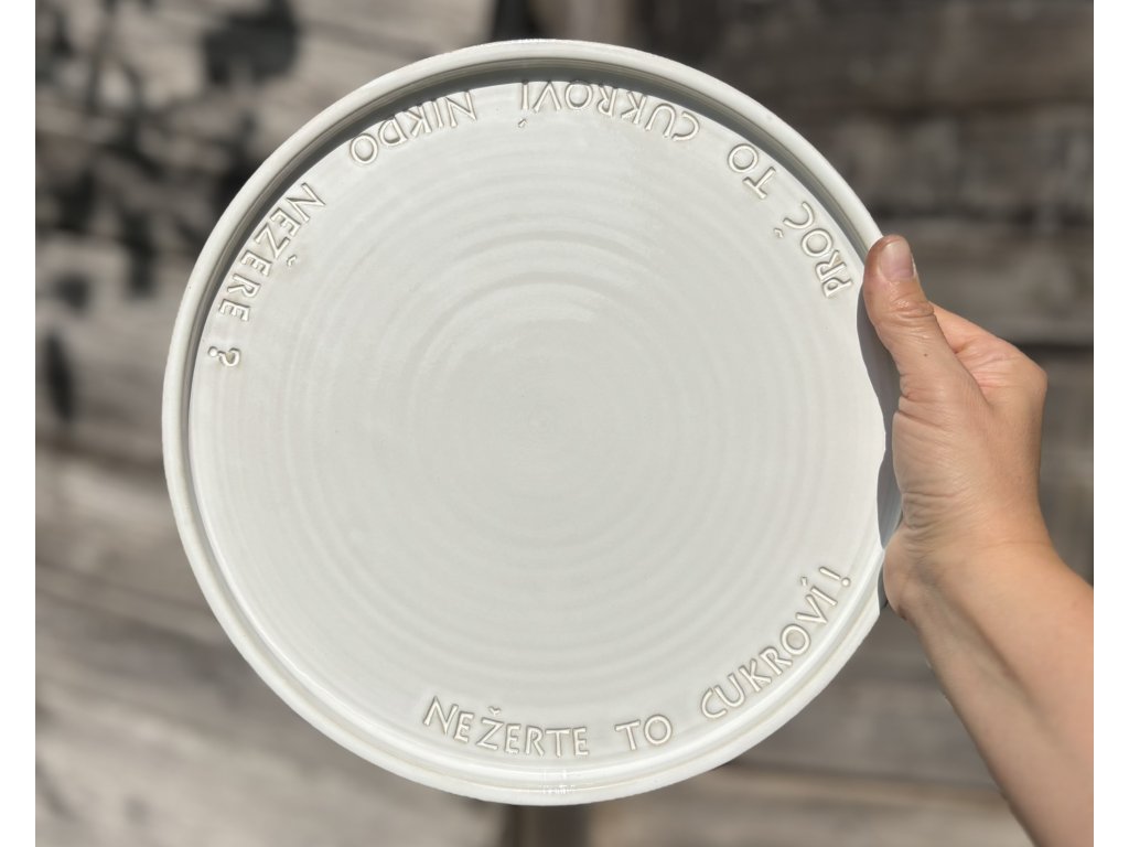 Talíř na cukroví je ručně vyroben ze světlé kameniny na hrnčířském kruhu, s bílou glazurou, vytlačeným nápisem "Nežerte to cukroví! Proč to cukroví nikdo nežere?"