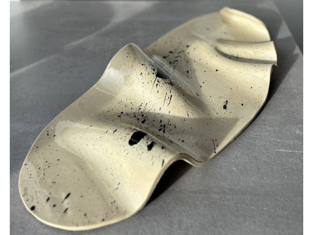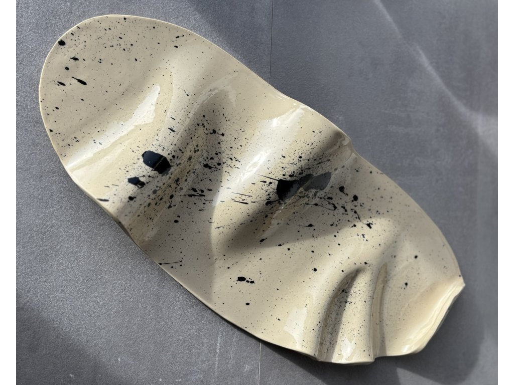 Servírovací talíř je vymodelován ze světlé kameniny, zdoben černými cákanci a jeho nerovnosti jsou otiskem ruční práce.