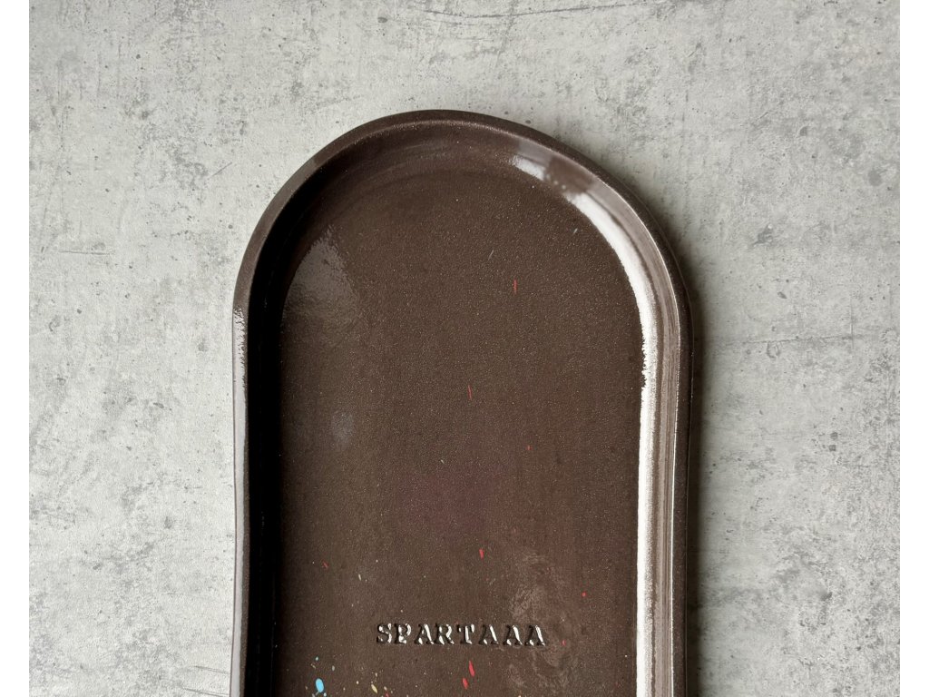 Talíř je ručně vyrobený z tmavé kameniny, s cákanci a vytlačeným nápisem "Spartaaa".