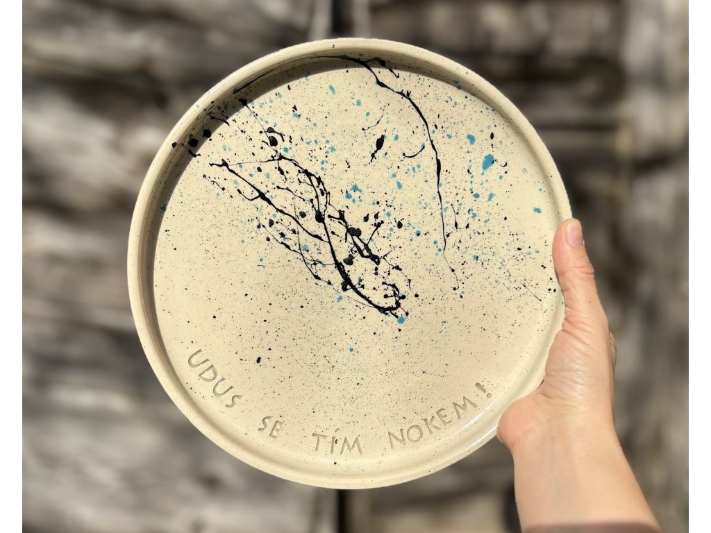 Talíř je ručně vyroben ze světlé kameniny na hrnčířském kruhu, s transparentní glazurou, černo modrými cákanci a vytlačeným nápisem "Udus se tím nokem!".