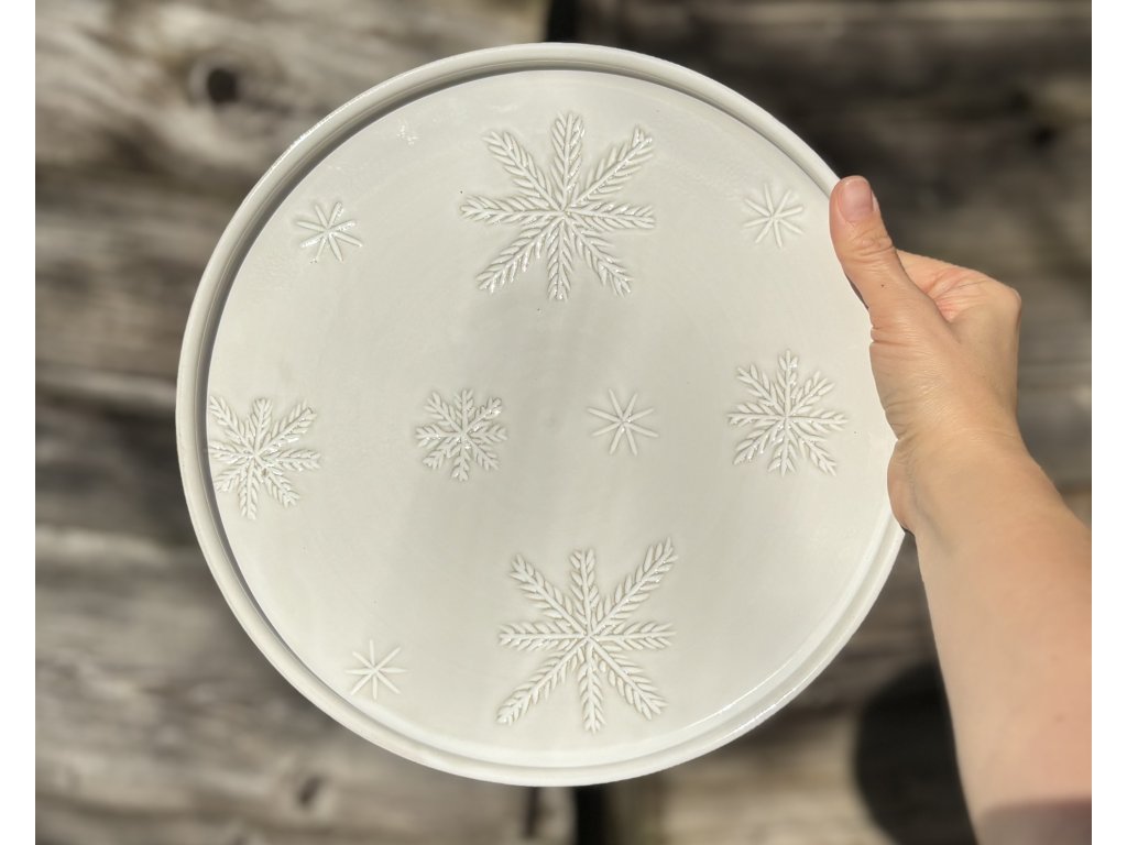 Talíř je ručně vyroben ze světlé kameniny na hrnčířském kruhu, s bílou glazurou a ručně vyrytými vločkami.