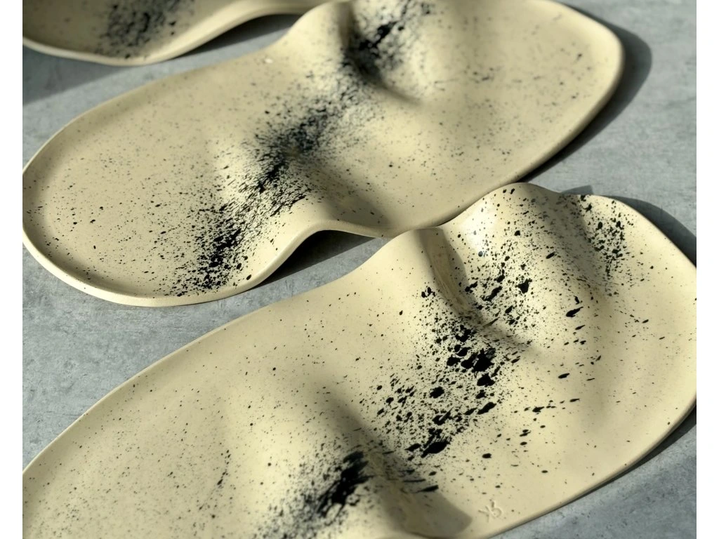 Výrazná dekorace černých cákanců působí jako spontánní umělecké gesto, které kontrastuje s jemným podkladem a dodává talíři moderní, až galerie připomínající charakter. Vynikne jak při servírování, tak i jako samostatný designový objekt.